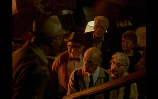 “I’m ready, now,” pines Mr. Conroy. “I’m ready.” The other residents comfort him with hands on his shoulders, as they all stare out into the night. The following morning, Mr. Conroy is found on the front lawn gleefully playing kick-the-can. Off to the side, Mr. Bloom observes Mr. Conroy at play, then looks into the camera and grins, “He’ll get it.”